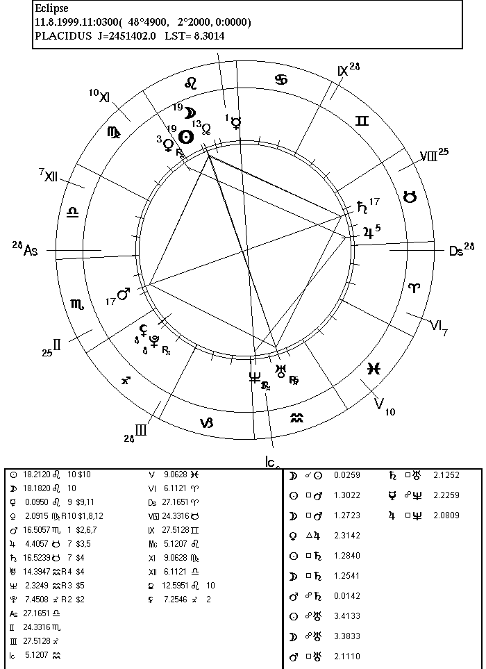 но ведь мы, астрологи, отлично знаем, что как раз напряженные конфигурации подталкивают человечество к единственно разумным действиям. Напротив, длительные гармоничные аспекты часто знаменуют собой времена совершенно беспрецедентные по варварству и жестокости (трин Уран-Нептун в 1937 г.) Да к тому же в катрене нет указания на то, что "ужас" или "испуг", внушенный этим "королем", хоть как-то оправдан. Обращаем внимание уважаемого читателя на то, что точка затмения попадает прямо между натальными позициями Венеры и Марса Франциска I.