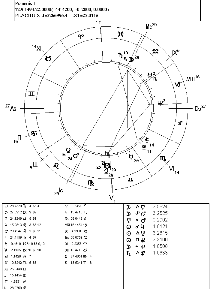 Стоит обратить внимание на Луну в Водолее на MC (внутренняя терпимость, играющая определяющую роль в жизненного выбора) в противостоянии к неточному соединению Марса и Венеры во Льве (вот она, страсть к завоеваниям, легко переключающаяся на страсть к искусству!). В Водолее находится также Уран, неизвестный астрологам XVI в. Однако, думается, главная конфигурация - тройное соединение Юпитера, Солнца и Верхнего лунного узла в последних градусах Девы на границе V дома. Постижение планов Создателя через личное творчество, устремленность духа в будущее, - вот что это такое. Этот человек был свободным только тогда, когда прислушивался не к своим вкусам и капризам, а тем, что диктовал ему его созидательный дух. Мы имеем дело с гороскопом человека светлого, связанного, конечно, условностями своей среды и своего времени (впрочем, это и хорошо, иначе король не был бы понят современниками и в лучшем случае заслужил репутацию чудака), но призванного сыграть положительную роль. Действительно, хаос во Франции был во многом предрешен и Франциск просто не мог его предотвратить, - но кто знает, не были бы религиозные войны в этой стране гораздо более кровавыми и длительными, если бы не смягчающее, живительное влияние идеологии Ренессанса?